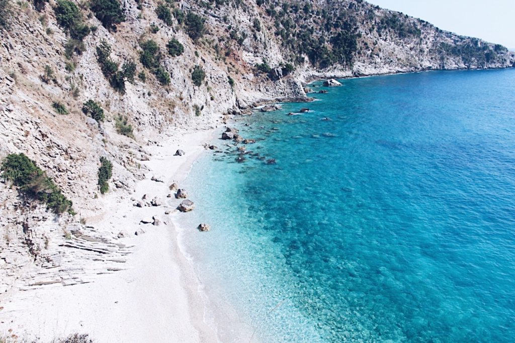 Der Strand von Gjipea liegt in einer von Felsen umgebenen 70 Meter hohen Bucht. Um zum Strand zu gelangen, wandern Sie in die Schlucht herunter.